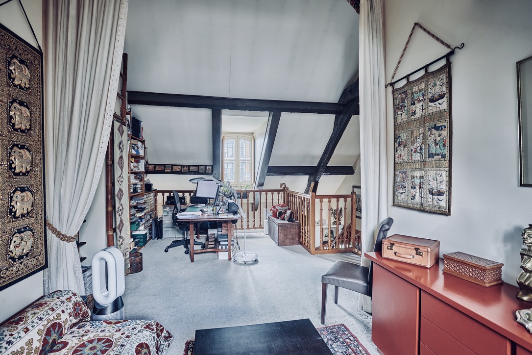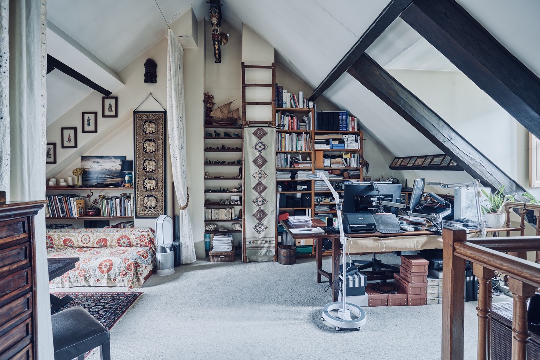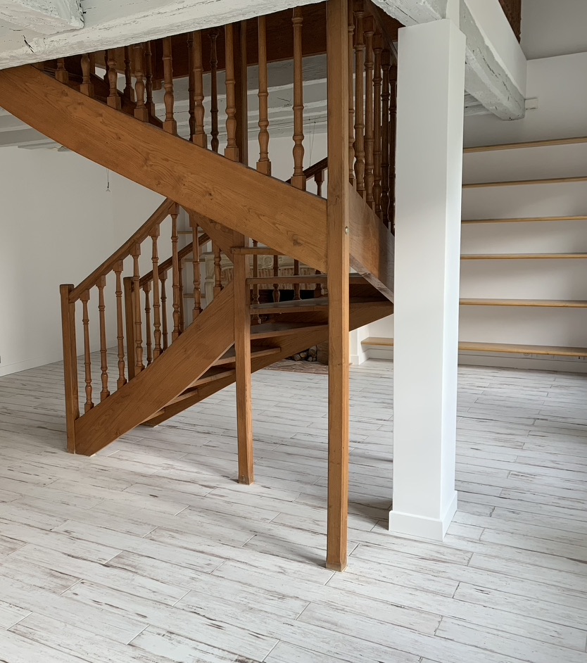 Dans un souci de luminosité et pour accentuer la sensation de hauteur, les poutres apparentes ont été soigneusement poncées et badigeonnées d’un gris brume, créant ainsi une atmosphère à la fois aérée et chaleureuse.