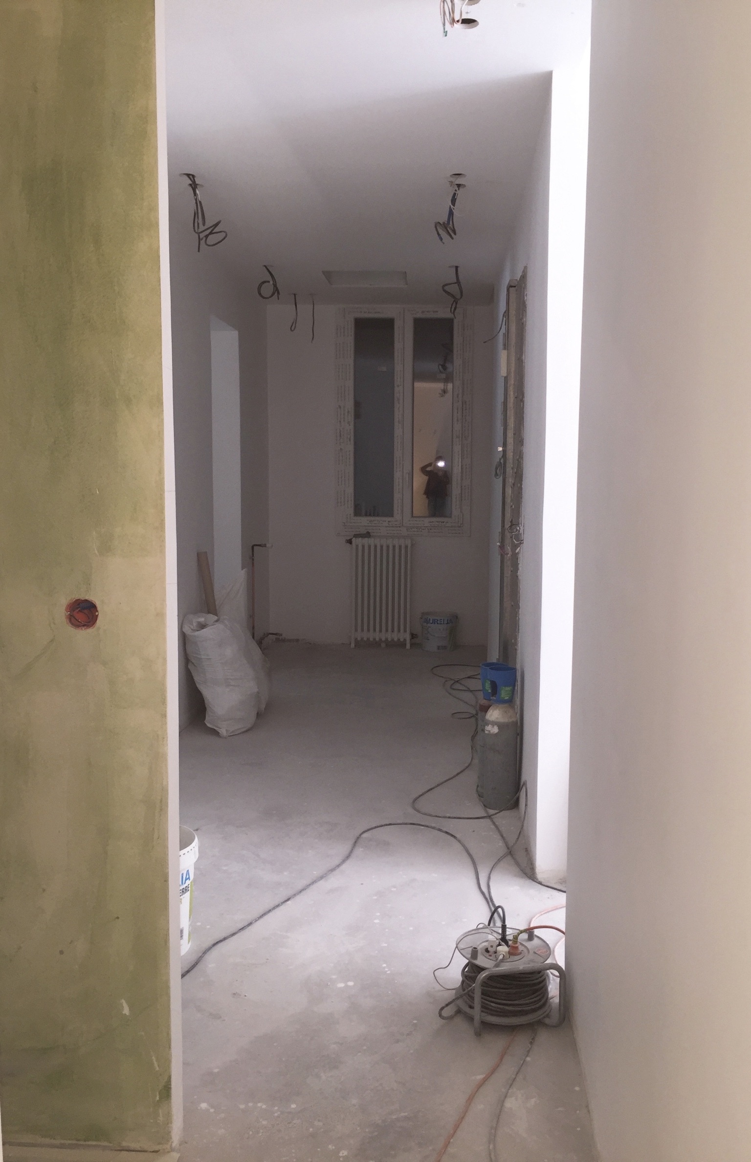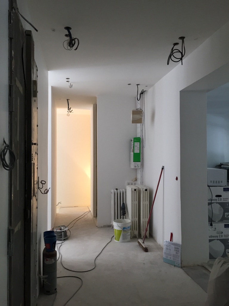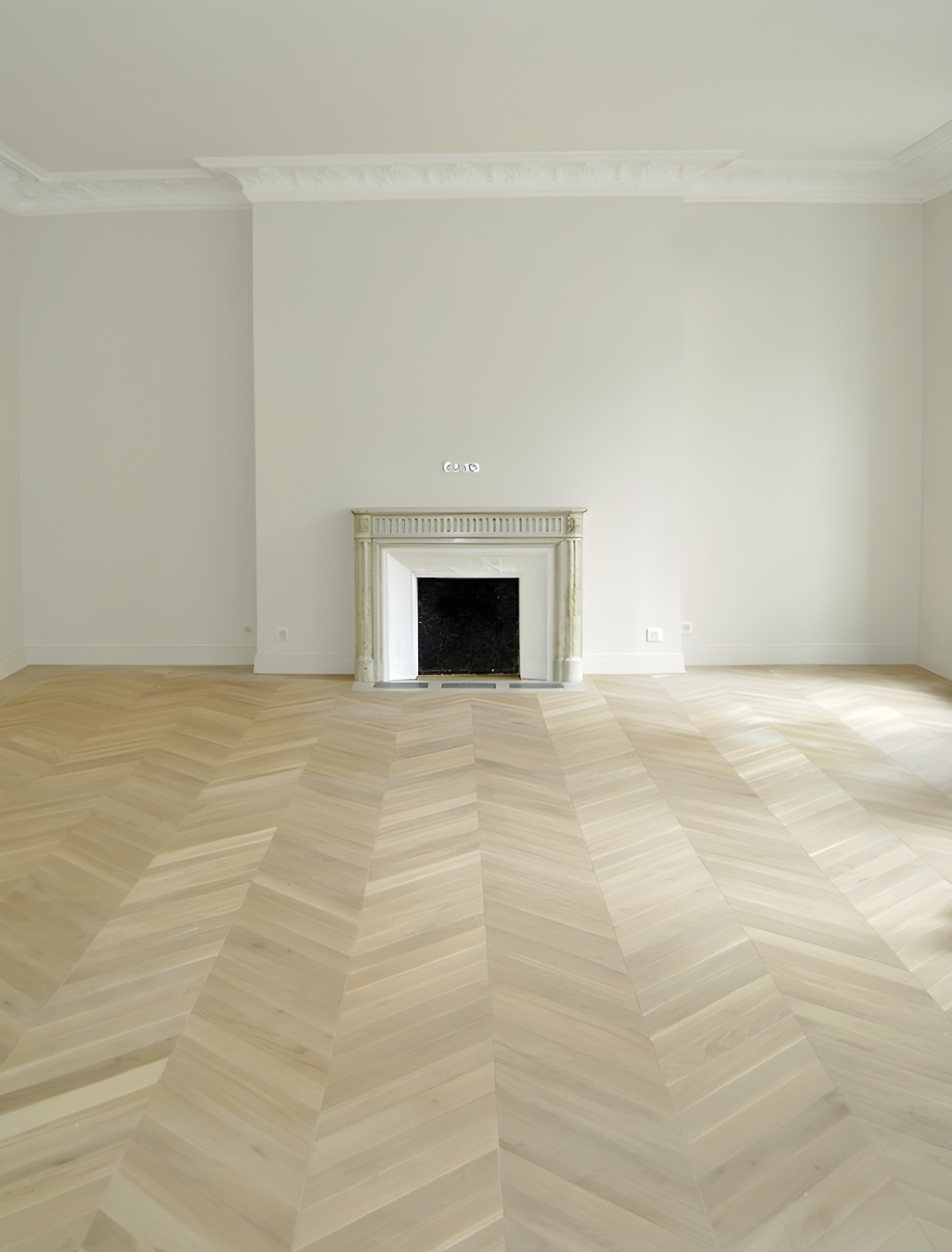 Une nouvelle chape a été coulée sur toute la surface de l’appartement pour favoriser l’isolation l’acoustique de l’appartement. Nous avons profité de l’ouverture de tous les sols pour faire passer les réseaux et les encastrer avant de poser le parquet en pointe de Hongrie.