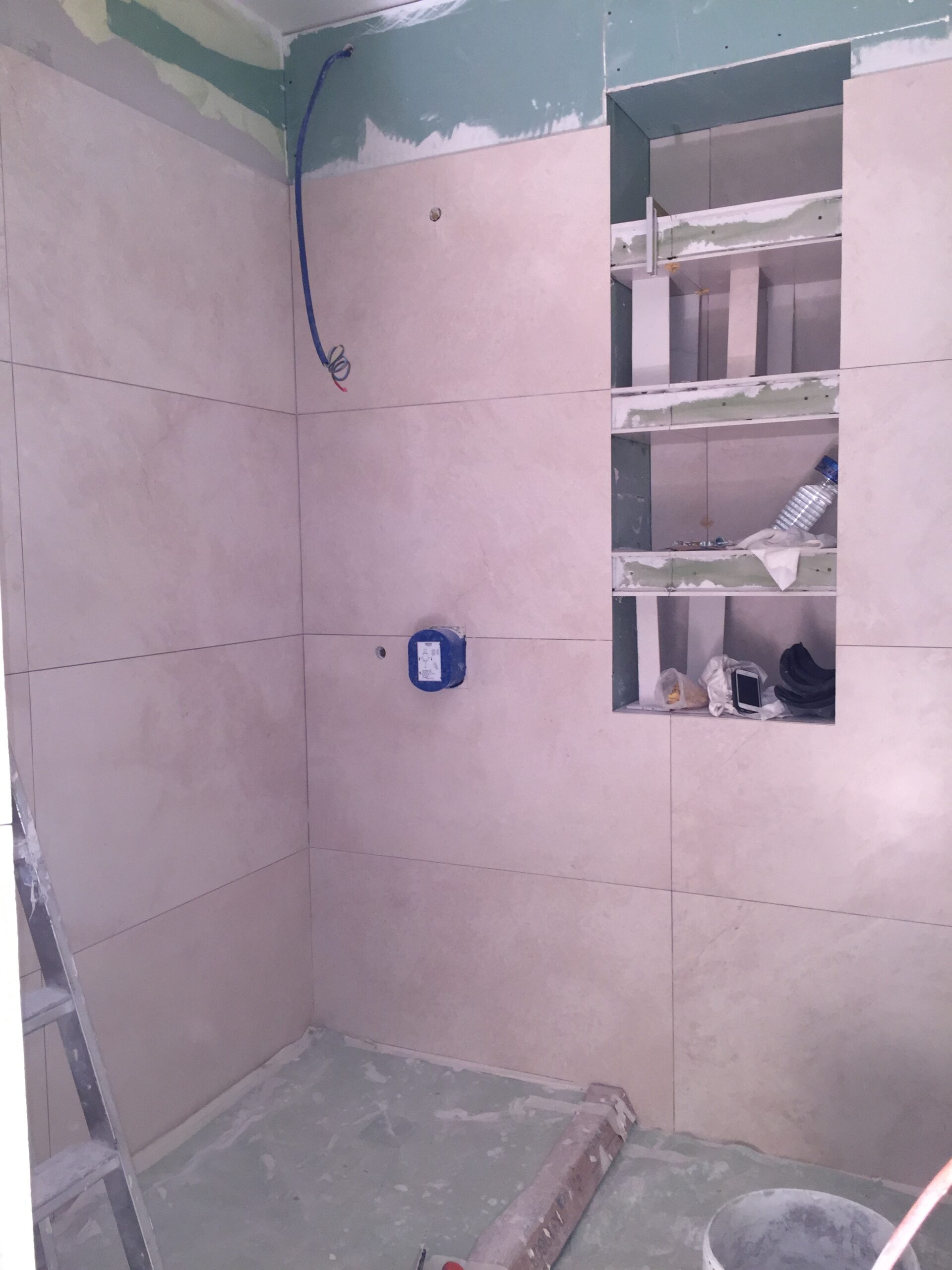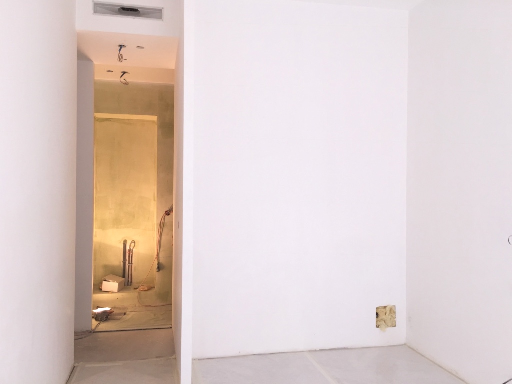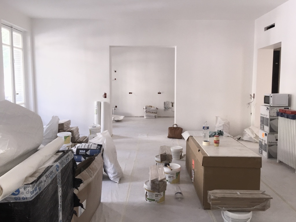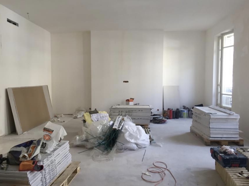 Une nouvelle chape a été coulée sur toute la surface de l’appartement pour favoriser l’isolation l’acoustique de l’appartement. Nous avons profité de l’ouverture de tous les sols pour faire passer les réseaux et les encastrer avant de poser le parquet en pointe de Hongrie.