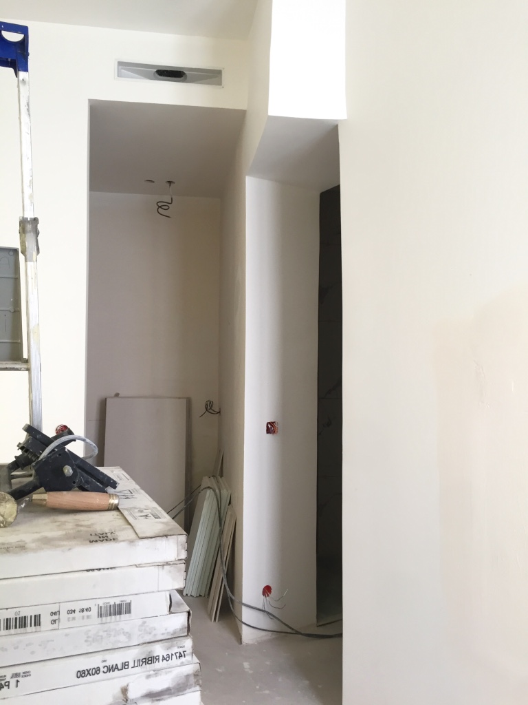 Le hall d’entrée était beaucoup trop grand, le redimensionnement a été nécessaire en fermant une des 3 entrées menant à la pièce principale pour créer une ambiance de standing.