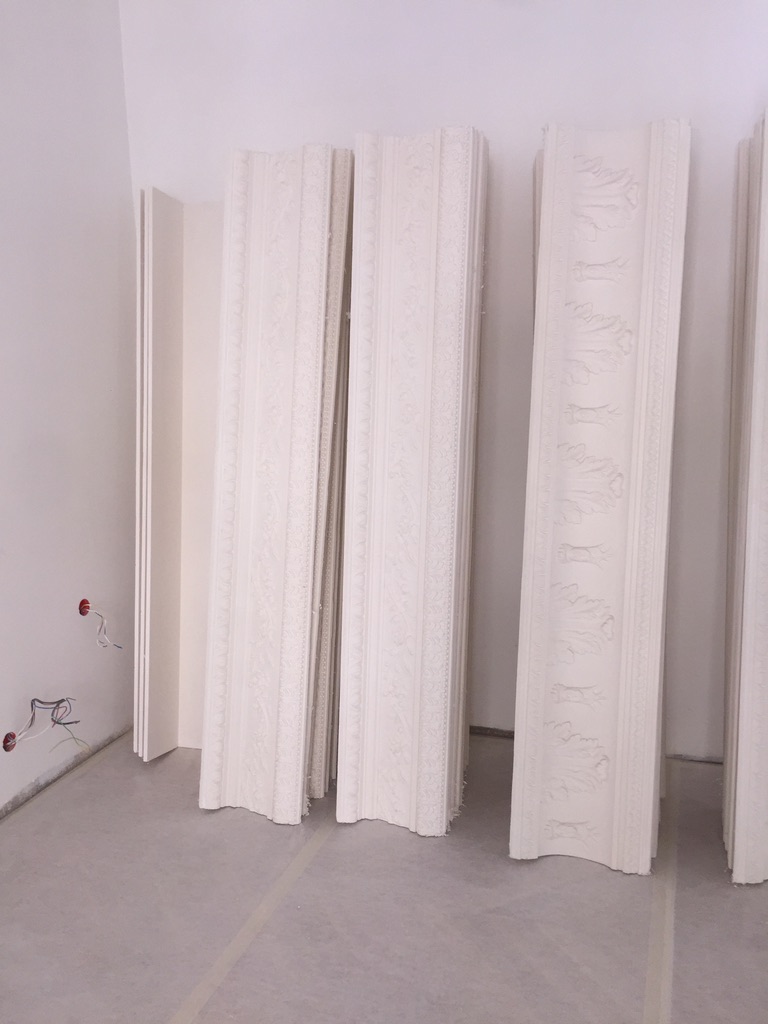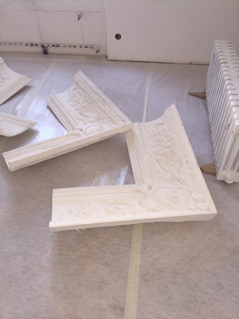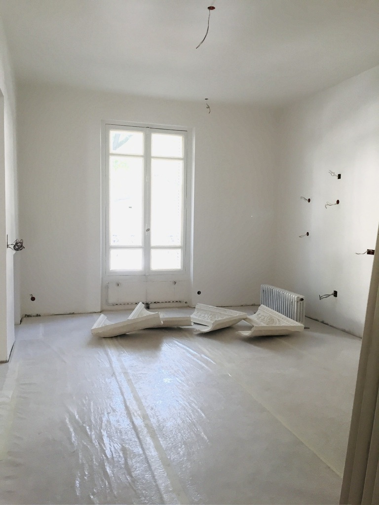 Au plafond, les contours des nouvelles corniches sont identiques dans chaque espace pour donner un aspect naturel et authentique de l’appartement.