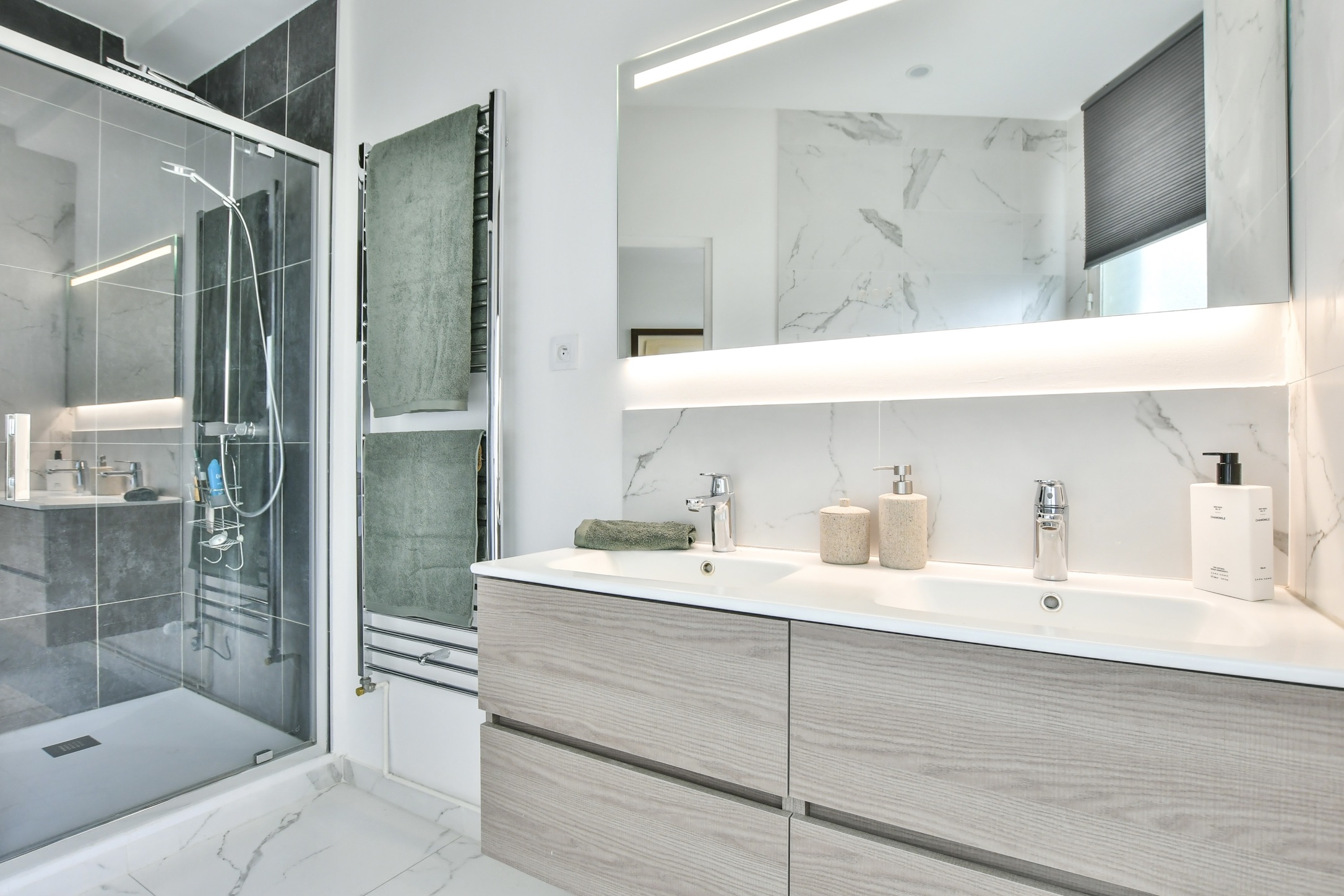 Le premier objectif était de créer une véritable suite parentale, comprenant une salle de bain spacieuse, équipée d’une baignoire généreuse et d’une douche. Le sol et les murs aspect marbré apportent une touche d’authenticité à l’ensemble. Pour agrandir visuellement l’espace, un grand miroir se marie harmonieusement avec le meuble en chêne et sa double vasque en céramique fine, créant une atmosphère élégante et fonctionnelle.