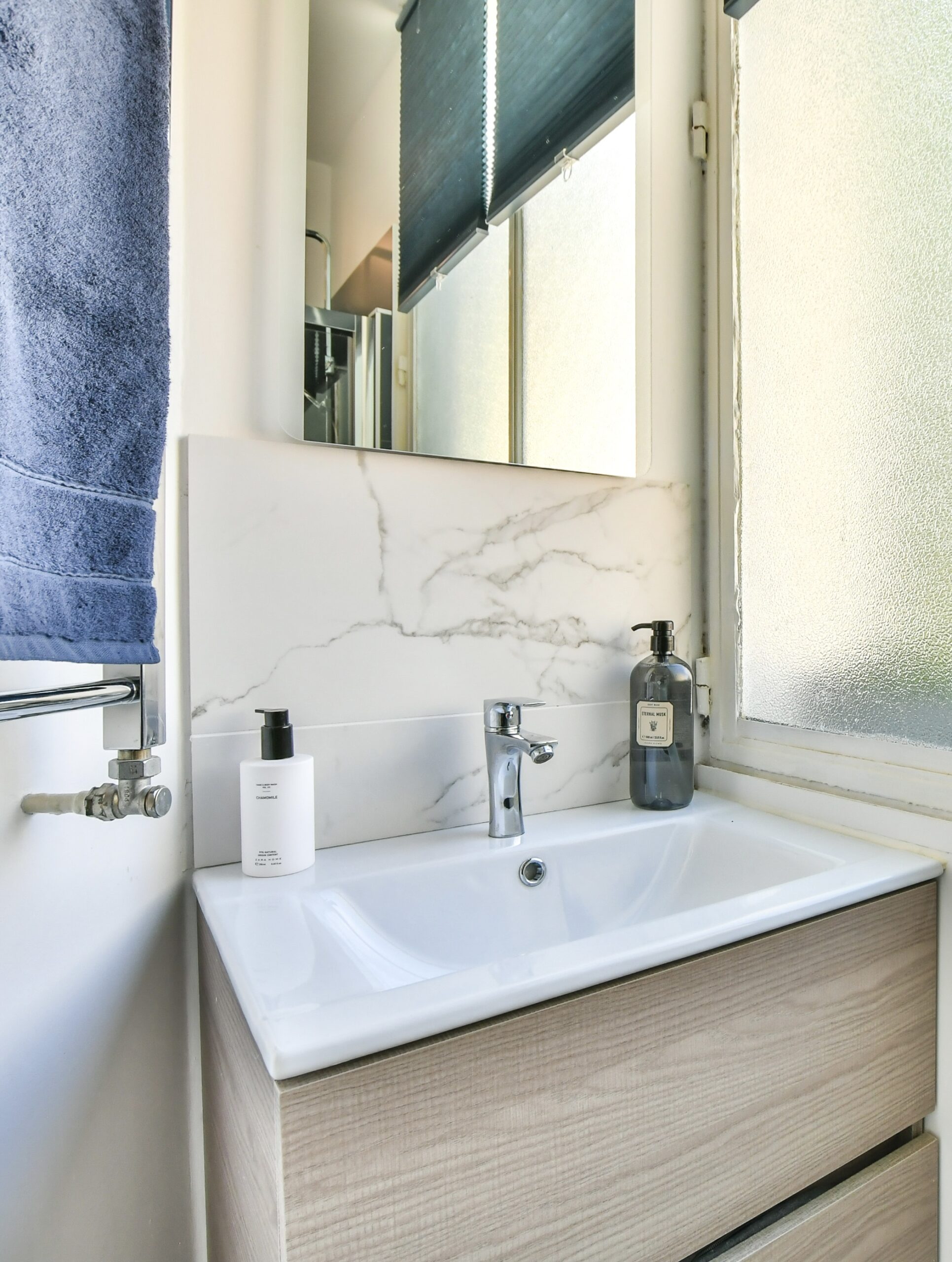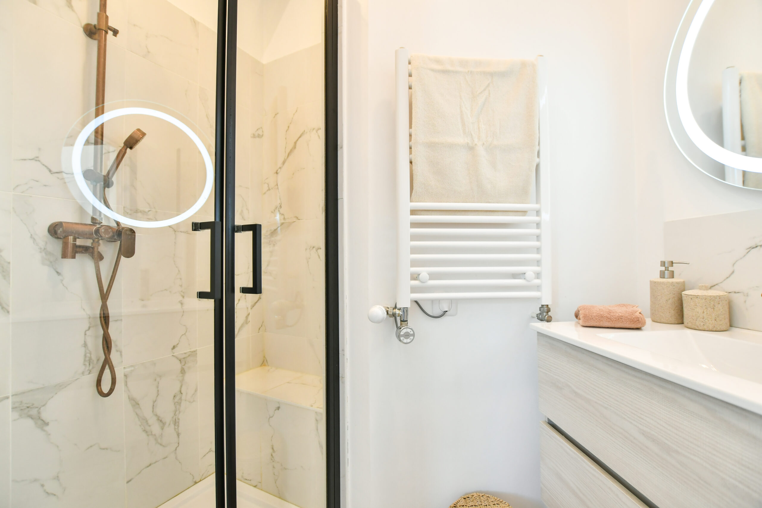 La troisième chambre a été entièrement repensée, intégrant une petite salle d’eau au design minimaliste et raffiné, offrant à la fois confort et élégance.