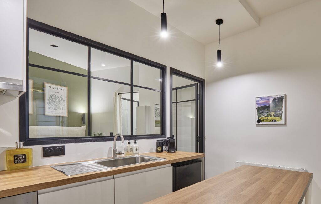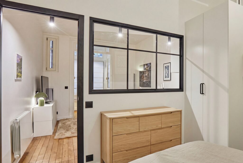 Afin d’offrir davantage d’espace et de confort, l’agencement a été entièrement repensé. L’ancienne cuisine a laissé place à une véritable chambre. La cloison a été avancée vers le salon afin de créer un volume nuit plus généreux et fonctionnel. Pour préserver la luminosité naturelle et maintenir une belle circulation de la lumière, une verrière accompagnée de sa porte verrière a été intégrée, apportant caractère et élégance à l’ensemble.