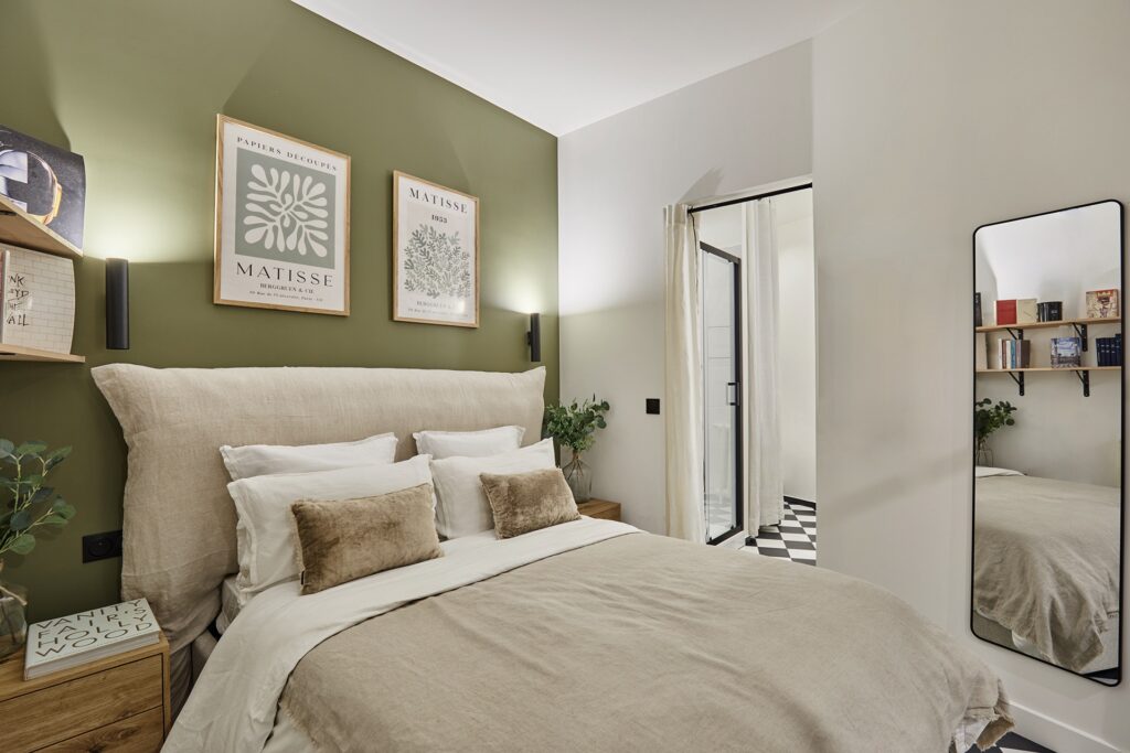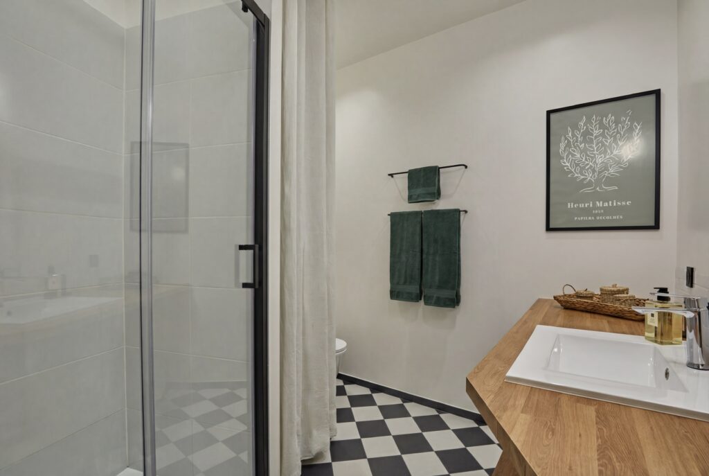 La salle de bain s’est transformée en une élégante salle d’eau, pensée avec des rangements intégrés. Le sol en damier, souhaité par ma cliente et décliné jusque dans la chambre, apporte rythme et caractère. Une touche moderne et joyeuse, subtilement raffinée, qui signe l’identité du lieu..