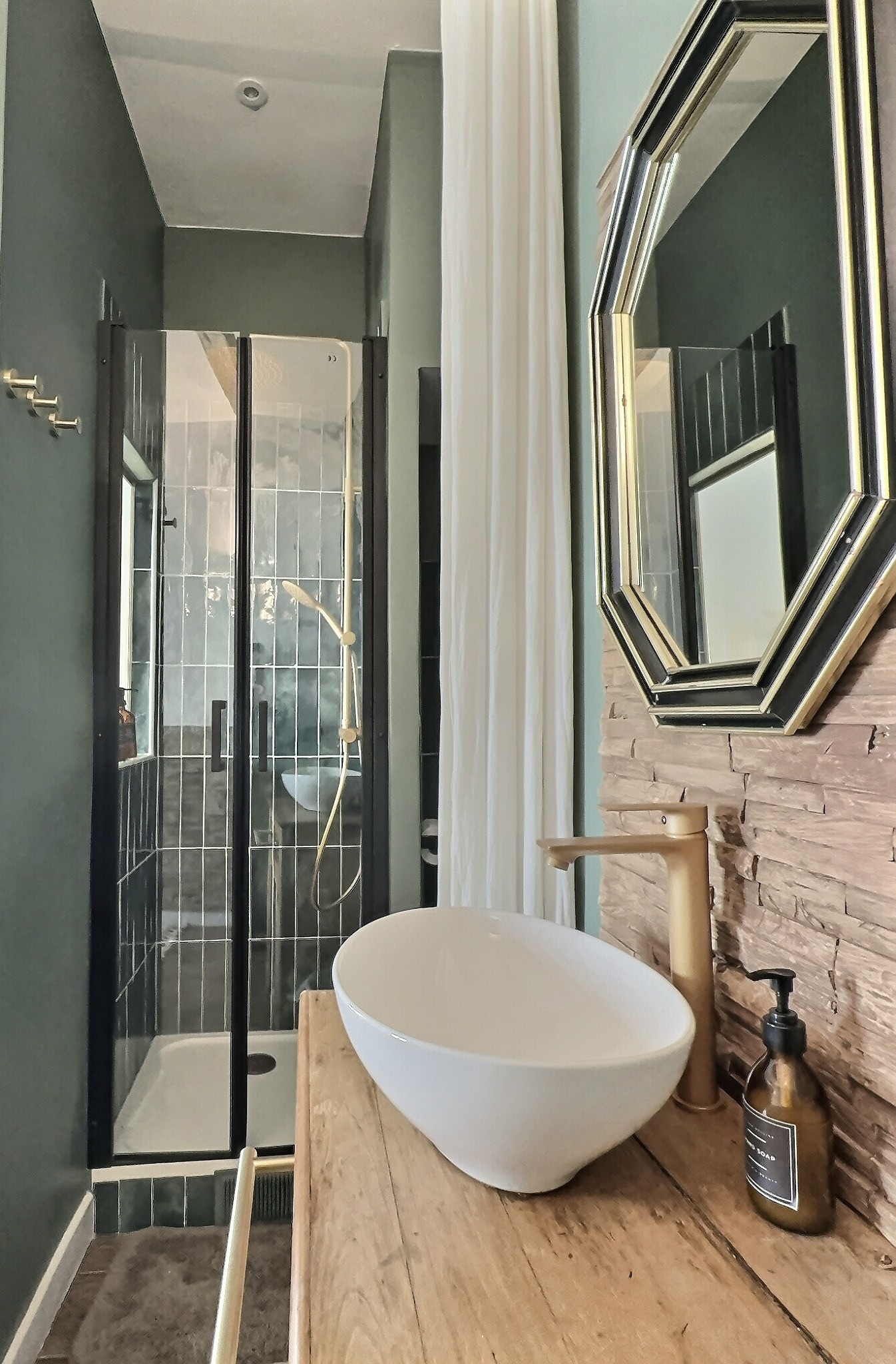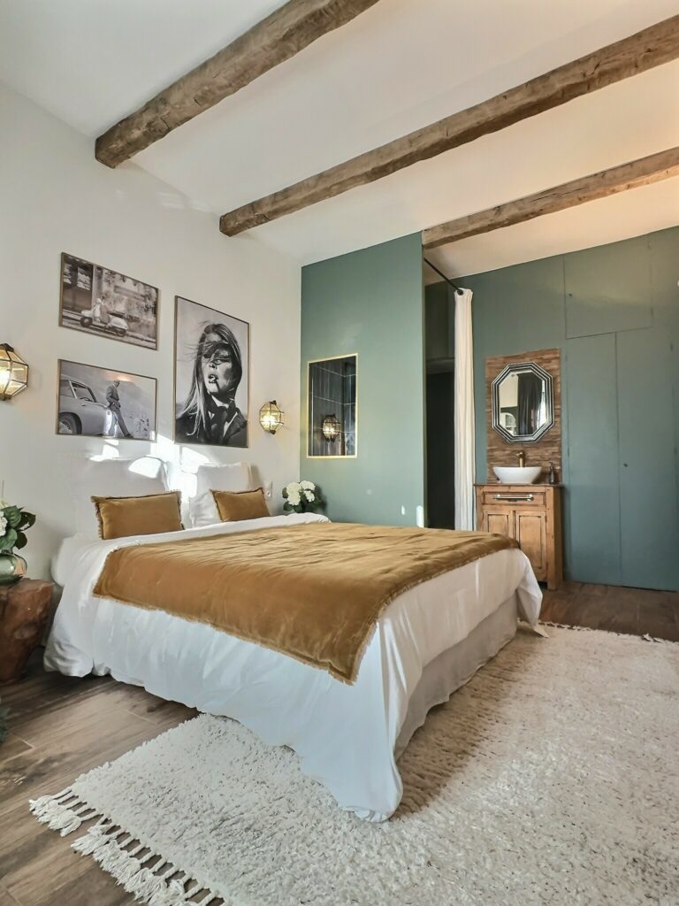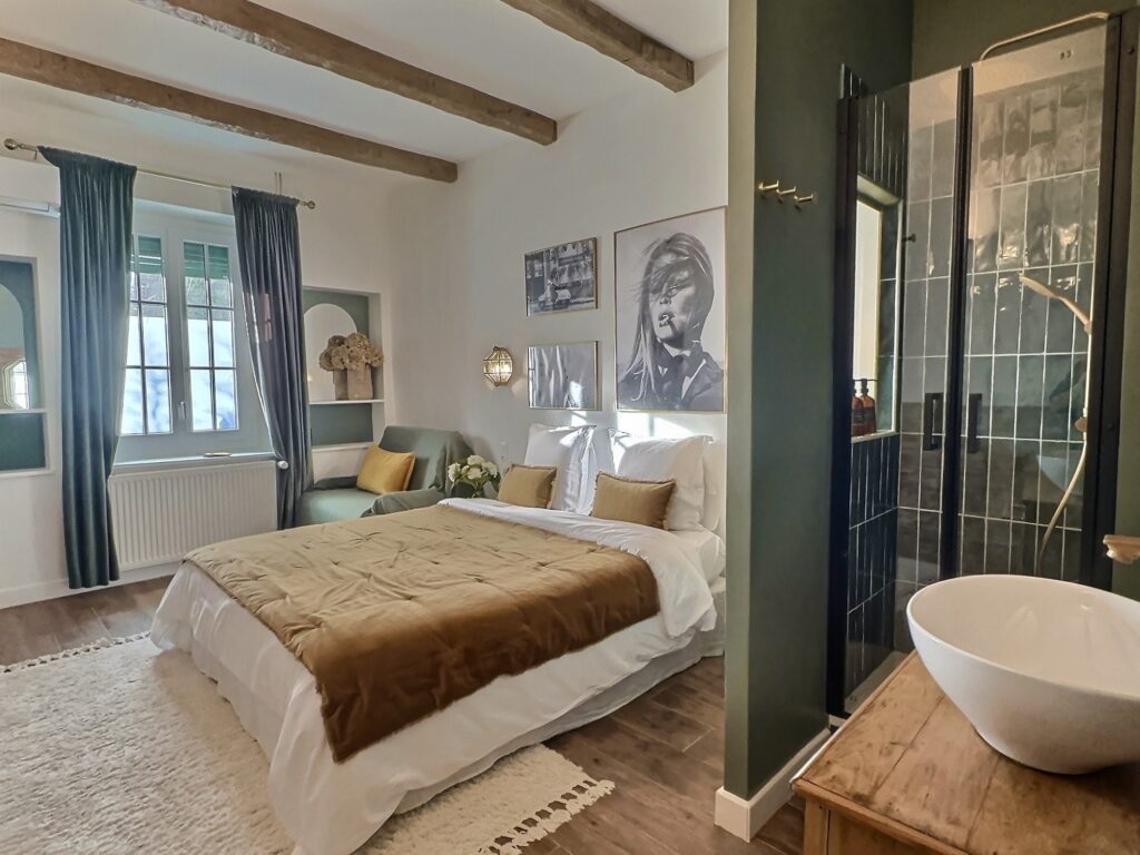 Anciennement une chambre communicante, cet espace a été cloisonné pour offrir plus d’intimité, tout en conservant un dressing. Une douche a été ajoutée, accompagnée d’un meuble vasque et d’un sanitaire astucieusement dissimulé derrière la douche. Côté décoration, la chambre se décline dans des nuances modernes et apaisantes : un vert « Green Smoke » a été appliqué, apportant une atmosphère sereine et élégante. Les poutres apparentes, désormais mises en valeur, confèrent à la pièce une touche art déco, sublimée par des accents en laiton.