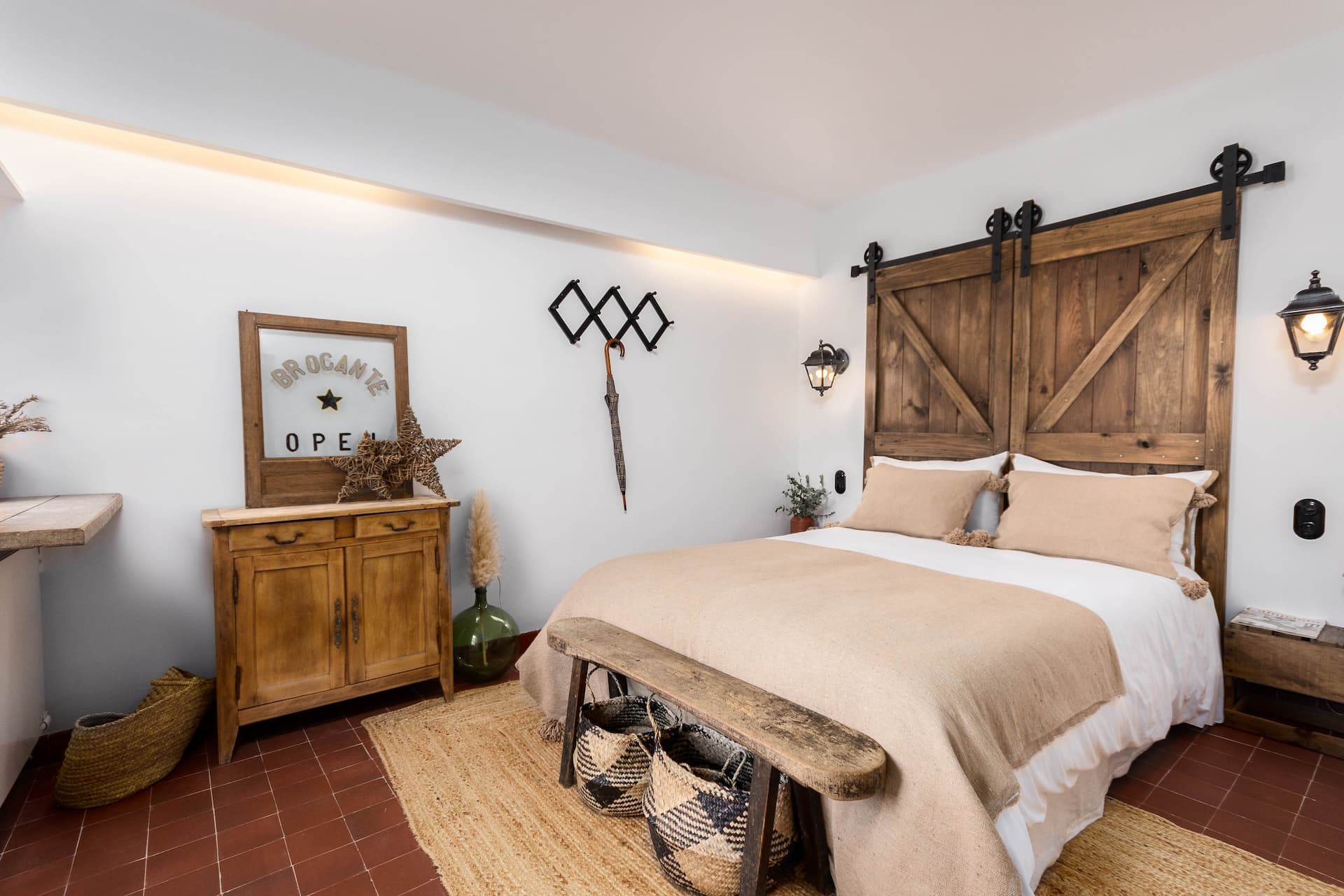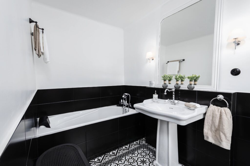 Cette chambre a été métamorphosée en un véritable havre de paix, alliant le bois chaleureux au carrelage ancien pour créer une ambiance campagne résolument atypique. La salle de bain a été entièrement réhabilitée dans une palette élégante de black & white, sublimée par une robinetterie rétro qui lui confère une touche chic et raffinée.