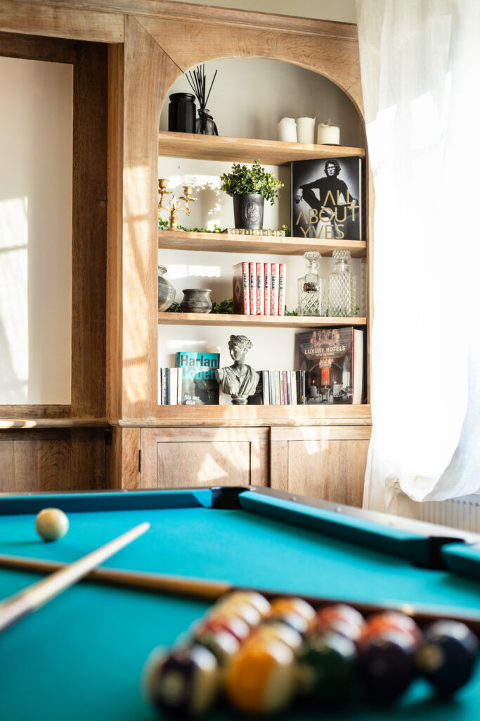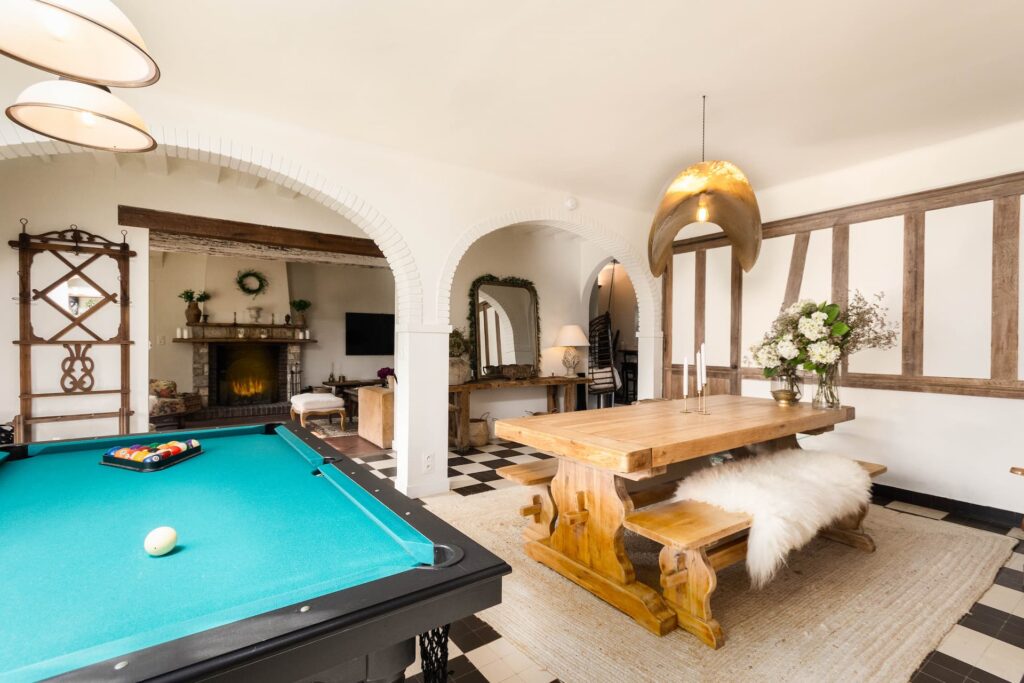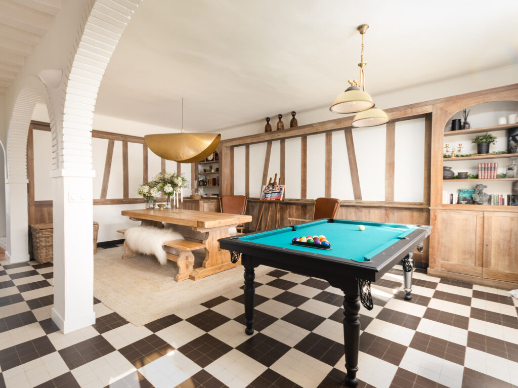 Pour renforcer l’ambiance champêtre, un colombage en bois sur mesure a été installé dans la salle à manger, accompagné de deux bibliothèques en bois conçues spécialement, afin de créer un espace à la fois unique et chaleureux.