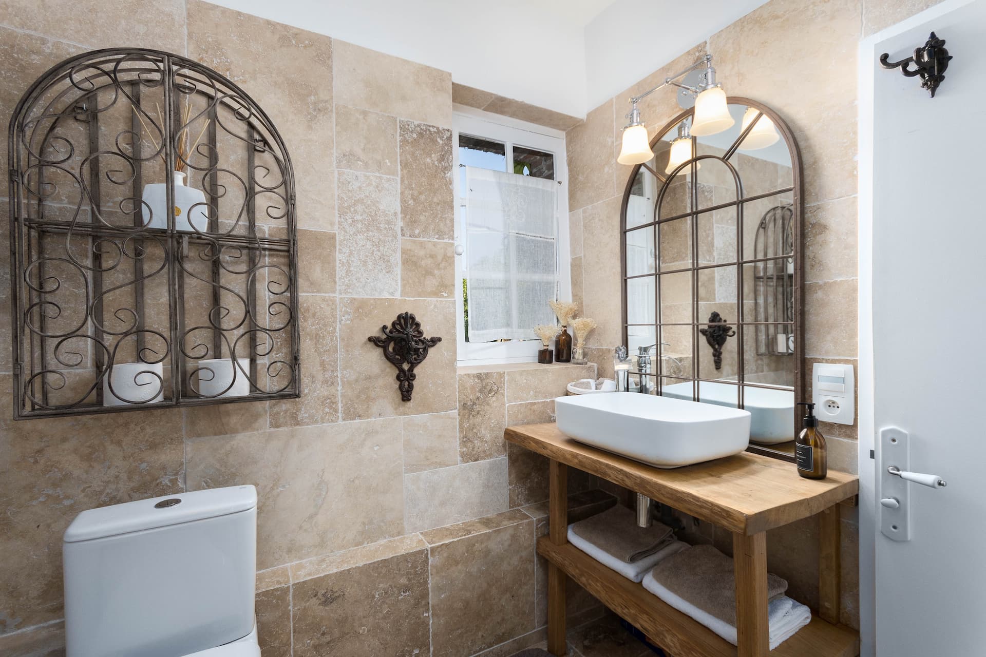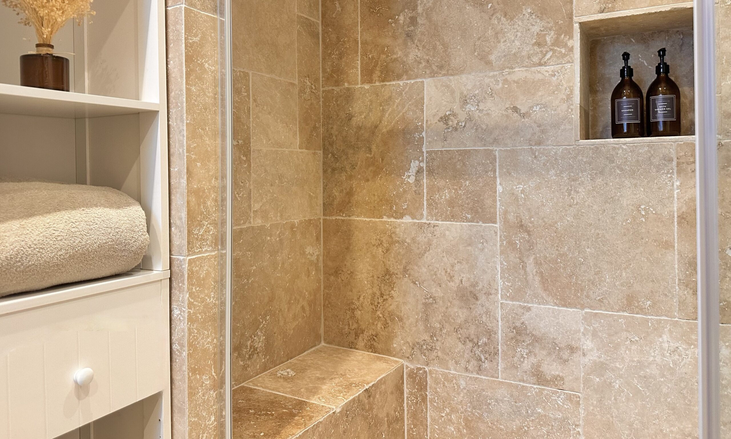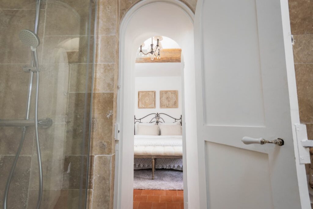 L’ancienne salle de bain, attenante à la chambre, a été transformée en une spacieuse salle d’eau, équipée d’une élégante douche grande dimension, agrémentée d’un banc pour plus de confort. Un meuble sur mesure en chêne a été conçu pour accueillir une vasque, complété par un mitigeur au style ancien, apportant une touche d’élégance. Les murs sont habillés de travertin, une pierre naturelle intemporelle, utilisée non seulement pour son esthétique mais aussi pour sa longue histoire en tant que matériau décoratif.