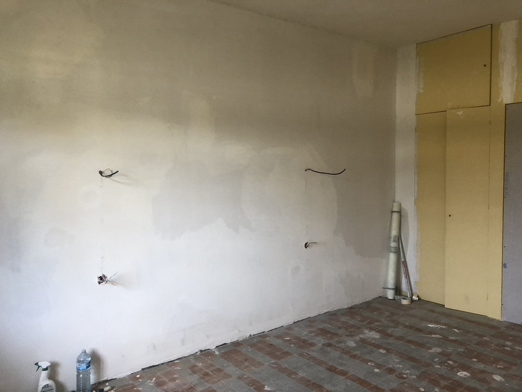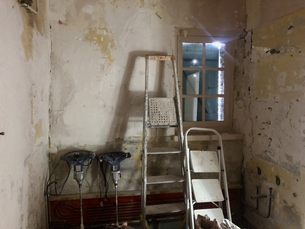 Anciennement une chambre communicante, cet espace a été cloisonné pour offrir plus d’intimité, tout en conservant un dressing. Une douche a été ajoutée, accompagnée d’un meuble vasque et d’un sanitaire astucieusement dissimulé derrière la douche. Côté décoration, la chambre se décline dans des nuances modernes et apaisantes : un vert « Green Smoke » a été appliqué, apportant une atmosphère sereine et élégante. Les poutres apparentes, désormais mises en valeur, confèrent à la pièce une touche art déco, sublimée par des accents en laiton.
