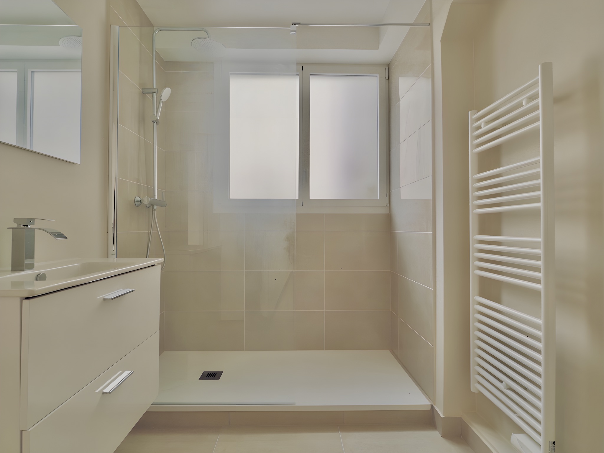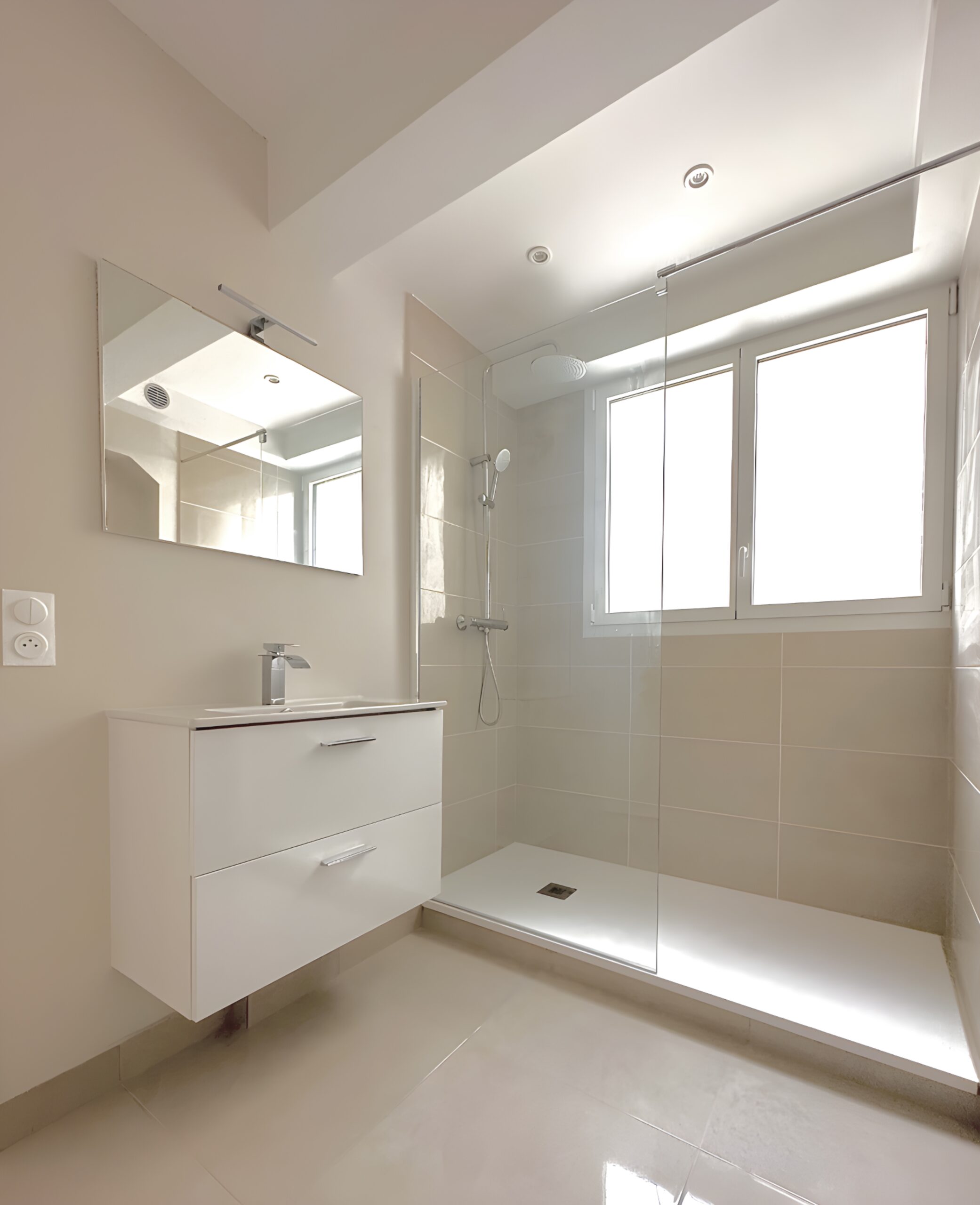 La salle de bains a été entièrement rénovée, incluant le remplacement de la baignoire par une douche pour améliorer la fonctionnalité de l’espace. Les finitions ont été choisies dans des teintes douces et apaisantes, créant ainsi une ambiance agréable et contemporaine.
