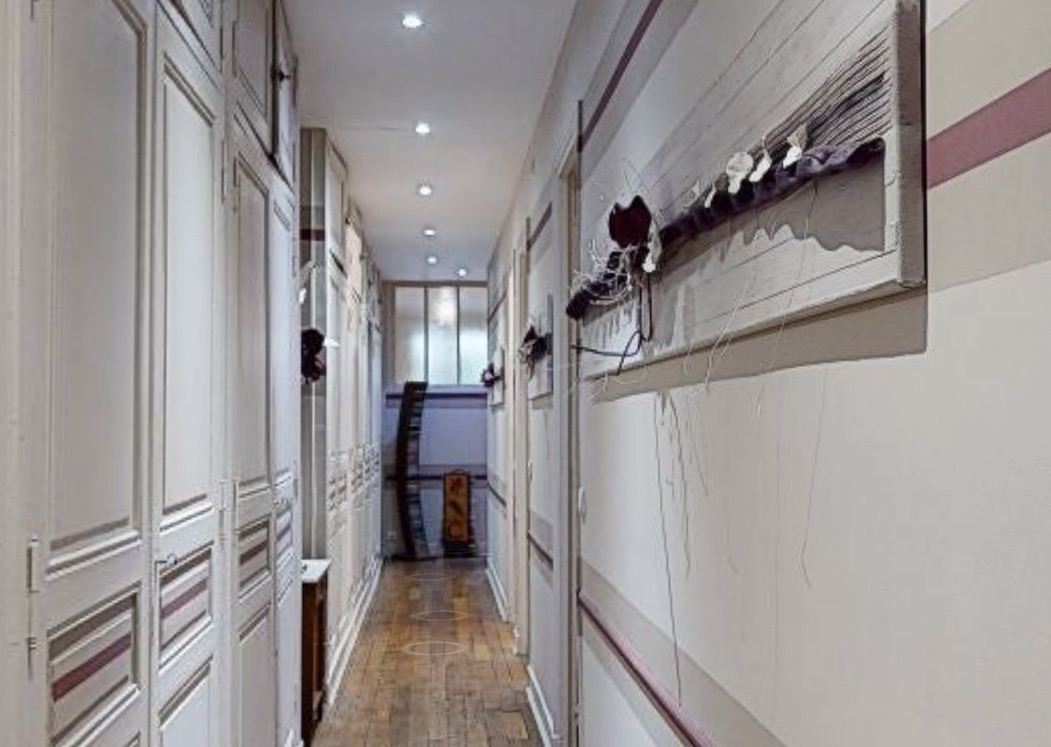 Dans ce long couloir relativement sombre, nous avons décloisonné les différents espaces pour installer des verrières sur-mesure, permettant ainsi à la lumière de circuler librement. Nous avons également choisi des murs blancs, créant un contraste élégant avec les verrières noires, renforçant ainsi la luminosité et l’esthétique de l’ensemble.